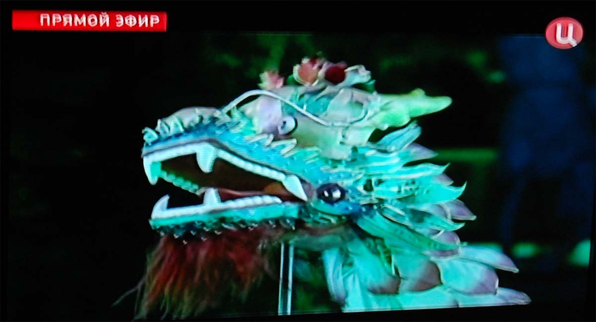 Китайские артисты представили свою пляску драконов. Великолепное выспупление, оно прекрасно смотрелось бы в любом другом месте, но не на Красной площади. Если вы не забыли, то на Гербе России и Гербе Москвы изображён святой Георгий Победоносец, побеждающий дракона. Танцующий дракон на Красной площади смотрелся вполне двусмысленно. Телевидение не показало, как на этот танец смотрели президент и патриарх.